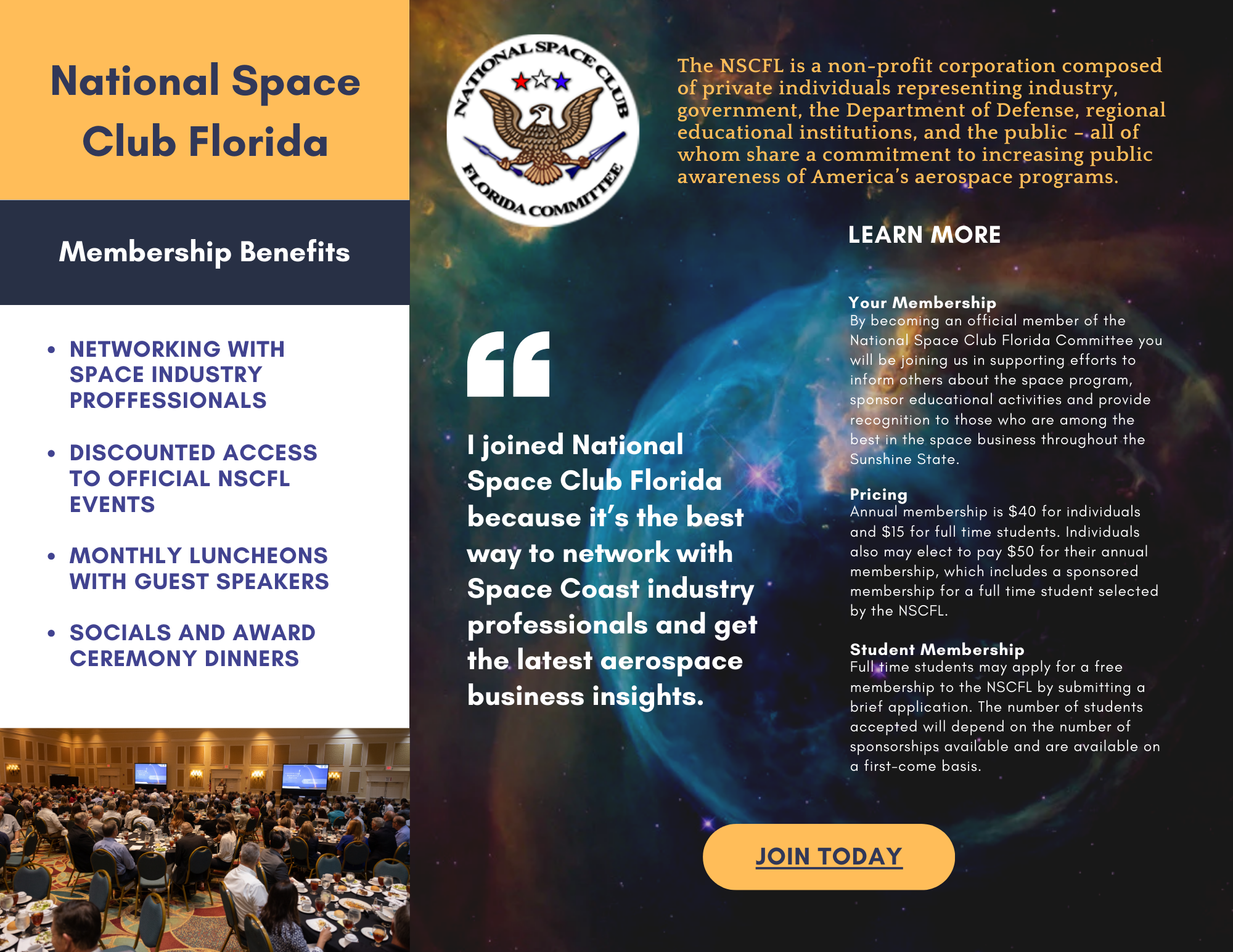 A one-year membership to the National Space Club Florida Committee begins on the date payment is received and remains active through the same month of the following year.